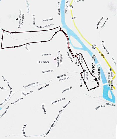 This is a mostly flat course on pavement. The course begins and ends in front of the courthouse at 101 Mitchell Street. After the starting line, you will cross the tracks and pass the Great Smoky Railroad, the Nantahala Brewery, head out to the Deep Creek area and make a loop surrounded by mountains. Some of the course follows the Tuckasegee River. After the Deep Creek loop, you will make your way back to the finish line. There will be water stations along the way.